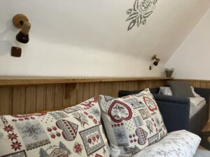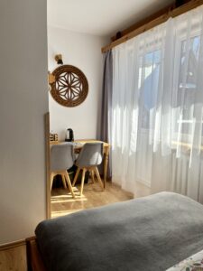 Kameralny pokój trzyosobowy typu Comfort z jednym łóżkiem podwójnym ( 140 cm x 200 cm) + jedną sofą pełnowymiarową z materacem ( 90 cm x 200 cm) , wyposażony w m.in. prywatną łazienkę z prysznicem, telewizor z płaskim ekranem- smart TV + Netflix oraz balkon z kompletem wypoczynkowym.