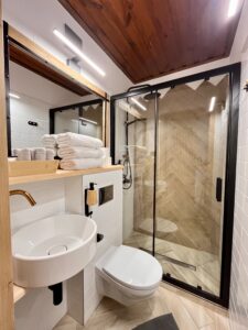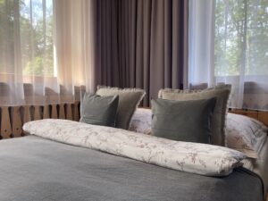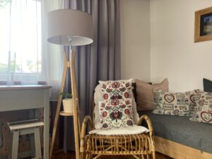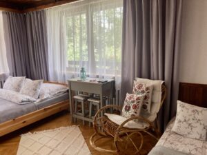 Kameralny pokój trzyosobowy typu Comfort idealny dla rodziny 2+1 z jednym łóżkiem podwójnym ( 140 cm x 200 cm) i jednym łóżkiem pojedynczym (90 cmx200cm), wyposażony w m.in. prywatną łazienkę z prysznicem , smart Tv + Netflix oraz balkon z kompletem wypoczynkowym.